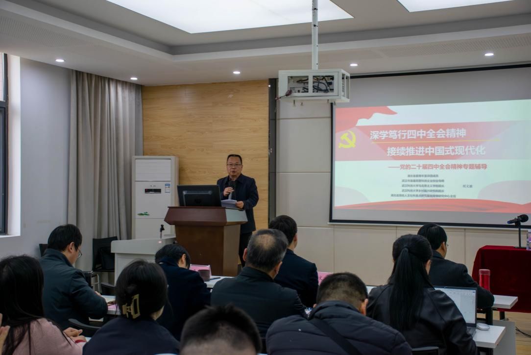 武科大网讯(通讯员林航煜)12月10日下午,我院在黄家湖校区教九楼90520会议室举行学习贯彻党的二十届四中全会精神宣讲会。马克思主义学院院长刘文波教授应邀作题为“深学笃行四中全会精神,持续推进中国式现代化”的专题宣讲,学院领导班子成员、教师代表、学生代表共70余人参会,会议由学院党委书记李建军主持。