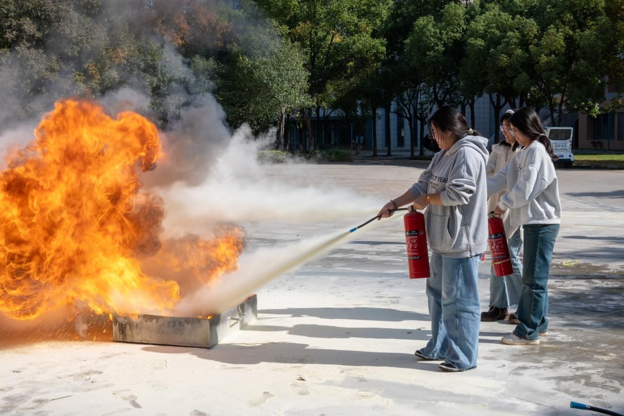 队伍小跑至图书馆后门空地,保卫处领导和消防员已布置好“火盆+灭火器”实操区。师生4人一组,轮番上手“提、拔、握、压”,对准油槽火焰根部喷射,白色干粉瞬间覆盖火点,围观同学掌声、惊呼不断。