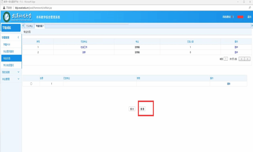 4、未到报名截止时间,可以随时重置自己的选择,重新选择分流专业,到期后,无法重置重选。